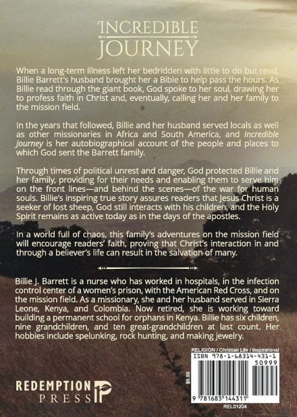 When a long-term illness left her bedridden with little to do but read, Billie Barrett's husband brought her a Bible to help pass the hours. As Billie read through the giant book, God spoke to her soul, drawing her to profess faith in Christ and, eventually, calling her and her family to the mission field. In the years that followed, Billie and her husband served locals as well as other missionaries in Africa and South America, and Incredible Journey is her autobiographical account of the people and places to which God sent the Barrett family. Through times of political unrest and danger, God protected Billie and her family, providing for their needs and enabling them to serve him on the front lines-and behind the scenes-of the war for human souls. Billie's inspiring true story assures readers that Jesus Christ is a seeker of lost sheep, God still interacts with his children, and the Holy Spirit remains as active today as in the days of the apostles. In a world full of chaos, this family's adventures on the mission field will encourage readers' faith, proving that Christ's interaction in and through a believer's life can result in the salvation of many.