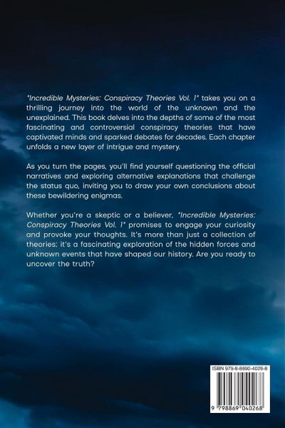 "Incredible Mysteries: Conspiracy Theories Vol. 1" takes you on a thrilling journey into the world of the unknown and the unexplained. This book delves into the depths of some of the most fascinating and controversial conspiracy theories that have captivated minds and sparked debates for decades. Each chapter unfolds a new layer of intrigue and mystery. As you turn the pages, you'll find yourself questioning the official narratives and exploring alternative explanations that challenge the status quo, inviting you to draw your own conclusions about these bewildering enigmas. Whether you're a skeptic or a believer, "Incredible Mysteries: Conspiracy Theories Vol. 1" promises to engage your curiosity and provoke your thoughts. It's more than just a collection of theories; it's a fascinating exploration of the hidden forces and unknown events that have shaped our history. Are you ready to uncover the truth? Featuring:¿¿¿¿¿¿Assassination of John F. Kennedy New World Order Korean Air Lines Flight 007 9/11 Malaysia Airlines Flight 370