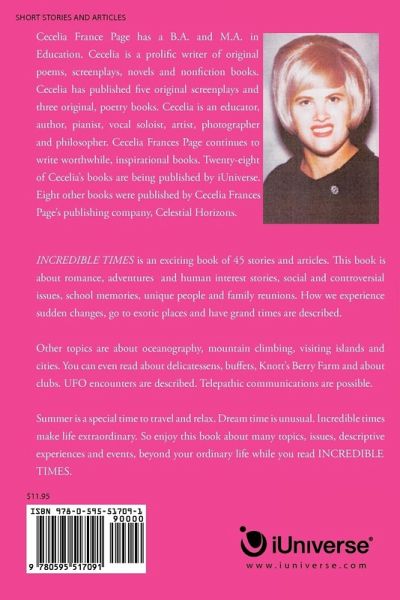 INCREDIBLE TIMES is an exciting book of 45 stories and articles. This book is about romance, adventures and human interest stories, social and controversial issues, school memories, unique people and family reunions. How we experience sudden changes, go to exotic places and have grand times are described. Other topics are about oceanography, mountain climbing, visiting islands and cities. You can even read about delicatessens, buffets, Knott's Berry Farm and about clubs. UFO encounters are described. Telepathic communications are possible. Summer is a special time to travel and relax. Dream time is unusual. Incredible times make life extraordinary. So enjoy this book about many topics, issues, descriptive experiences and events.