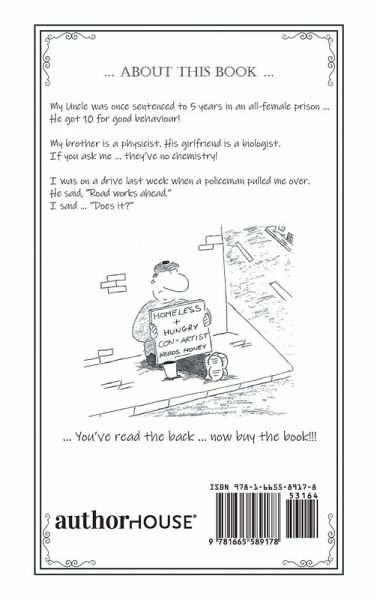... ABOUT THIS BOOK ... My Uncle was once sentenced to 5 years in an all-female prison ... He got 10 for good behaviour! My brother is a physicist. His girlfriend is a biologist. If you ask me ... they've no chemistry! I was on a drive last week when a policeman pulled me over. He said, "Road works ahead." I said ... "Does it?" ... You've read the back ... now buy the book!!!