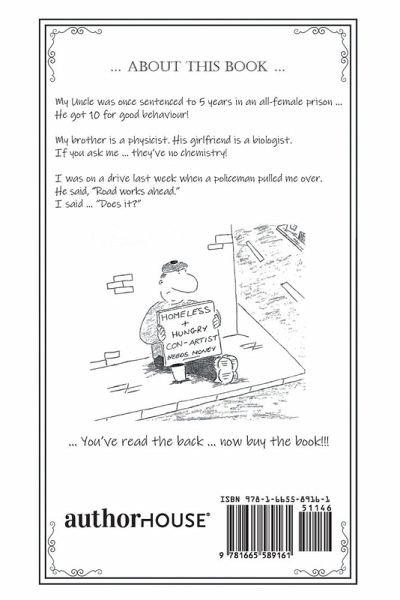 ... ABOUT THIS BOOK ... My Uncle was once sentenced to 5 years in an all-female prison ... He got 10 for good behaviour! My brother is a physicist. His girlfriend is a biologist. If you ask me ... they've no chemistry! I was on a drive last week when a policeman pulled me over. He said, "Road works ahead." I said ... "Does it?" ... You've read the back ... now buy the book!!!