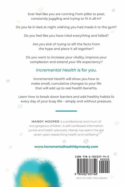 Ever feel like you are running from pillar to post; constantly juggling and trying to fi t it all in? Do you lie in bed at night wishing you had made it to the gym? Do you feel like you have tried everything and failed? Are you sick of trying to sift the facts from the hype and piece it all together? Do you want to increase your vitality, improve your complexion and extend your life expectancy? Incremental Health is for you. Incremental Health will show you how to make small, cumulative changes to your life that will add up to real health benefits. Learn h how to break down barriers and add healthy habits to every day of your busy life – simply and without pressure.