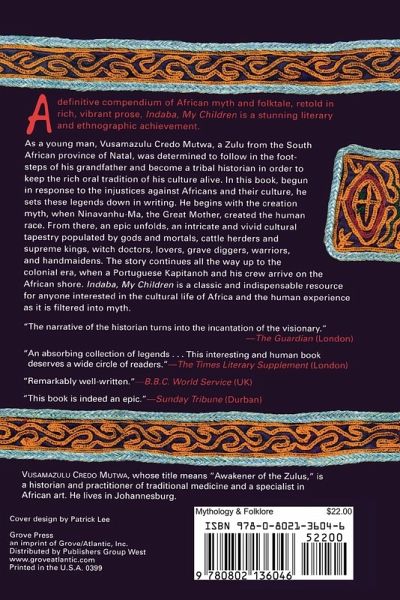 A definitive compendium of African myth and folktale, retold in rich, vibrant prose, Indaba, My Children is a stunning literary and ethnographic achievement. As a young man, Vusamazulu Credo Mutwa, a Zulu from the South African province of Natal, was determined to follow in the footsteps of his grandfather and become a tribal historian in order to keep the rich oral tradition of his culture alive. In this book, begun in response to the injustices against Africans and their culture, he sets these legends down in writing. He begins with the creation myth, when Ninavanhu-Ma, the Great Mother, created the human race. From there, an epic unfolds, an intricate and vivid cultural tapestry populated by gods and mortals, cattle herders and supreme kings, witch doctors, lovers, grave diggers, warriors, and handmaidens. The story continues all the way up to the colonial era, when a Portuguese Kapitanoh and his crew arrive on the African shore. Indaba, My Children is a classic and indispensable resource for anyone interested in the cultural life of Africa and the human experience as it is filtered into myth.