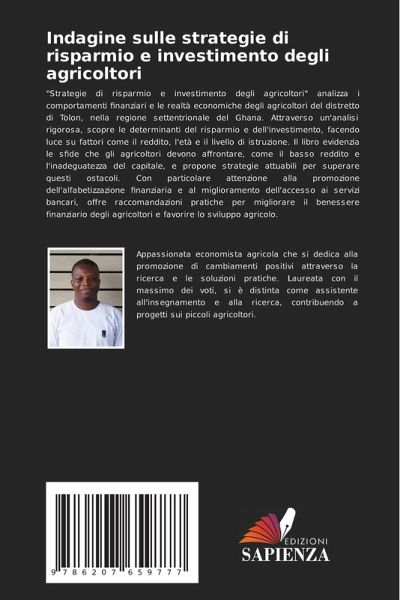 "Strategie di risparmio e investimento degli agricoltori" analizza i comportamenti finanziari e le realtà economiche degli agricoltori del distretto di Tolon, nella regione settentrionale del Ghana. Attraverso un'analisi rigorosa, scopre le determinanti del risparmio e dell'investimento, facendo luce su fattori come il reddito, l'età e il livello di istruzione. Il libro evidenzia le sfide che gli agricoltori devono affrontare, come il basso reddito e l'inadeguatezza del capitale, e propone strategie attuabili per superare questi ostacoli. Con particolare attenzione alla promozione dell'alfabetizzazione finanziaria e al miglioramento dell'accesso ai servizi bancari, offre raccomandazioni pratiche per migliorare il benessere finanziario degli agricoltori e favorire lo sviluppo agricolo.