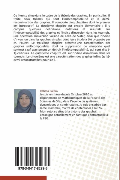 Ce livre se situe dans le cadre de la théorie des graphes. En particulier, il traite deux thèmes qui sont l'indécomposabilité et la demi-reconstruction des graphes. Il comporte cinq chapitres dont le premier est introductif. Le deuxième chapitre est encore élémentaire : il y compris quelques définitions, notations et résultats sur l'indécomposabilité des graphes et l'indice d'inversion dans les tournois, une opération d'inversion voisine de celle de Slater, ainsi que l'indice d'inversion dans les graphes simples dont leurs étude a été proposée par M. Pouzet. Le troisième chapitre présente une caractérisation des graphes indécomposables dont la suppression de n'importe quel sommet sauf exactement un détruit l'indécomposabilité, qui sont dits (-1)-critiques. Le quatrième chapitre est sur l'indice d'inversion dans les tournois. Le cinquième est une caractérisation des graphes infins ( k)-demi-reconstructibes pour k 7.