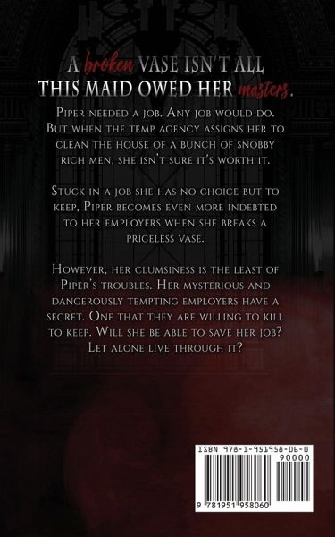 A broken vase isn’t all this maid owed her masters. Piper needed a job. Any job would do. But when the temp agency assigns her to clean the house of a bunch of snobby rich men, she isn’t sure it's worth it. Stuck in a job she has no choice but to keep, Piper becomes even more indebted to her employers when she breaks a priceless vase. However, her clumsiness is the least of Piper’s troubles. Her mysterious and dangerously tempting employers have a secret. One that they are willing to kill to keep. Will she be able to save her job? Let alone live through it?