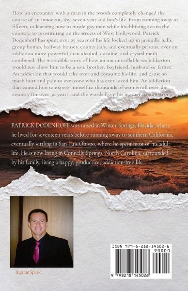 How an encounter with a man in the woods completely changed the course of an innocent, shy, seven-year-old boy's life.From running away at fifteen, to learning how to hustle gay men while hitchhiking across the country, to prostituting on the streets of West Hollywood.Patrick Dodenhoff has spent over 25 years of his life, locked up in juvenile halls, group homes, halfway houses, county jails, and eventually prisons, over an addiction, more powerful than alcohol, cocaine, and crystal meth combined.The incredible story of how an uncontrollable sex addiction, would not allow him to be a son, brother, boyfriend, husband, or father.An addiction that would take over and consume his life, and cause so much hurt and pain to everyone who has ever loved him.An addiction that caused him to expose himself to thousands of women all over the country for over 30 years, and the words from his mother to stay strong.