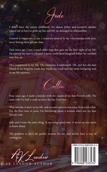 An age-gap RomCom... JADE: I didn't have the easiest childhood. An absent father and eccentric mother caused me to have to grow up fast and left me damaged in relationships. Control is important to me. I maintain control in my relationships with men, never letting them get too close. Four years ago, I met a much older man who gave me the best night of my life. He opened my eyes to pleasure I never could have imagined before he vanished into thin air. He's reappeared in my life. The chemistry is undeniable. Oh, and he's the best friend of my longtime crush, but maybe my crush isn't the most intriguing man in my life anymore. COLLIN: Four years ago, I made a mistake with the cousin of my best friend's wife. The same wife I've had a crush on since the day I met her. That mistake is back in my life, and we can't seem to stay away from each other. For the first time in years, I'm fantasizing about a woman who's not my best friend's wife. Jade and I want the same thing. A no-strings good time. A secret no one needs to know about. The problem is, she's the perfect woman for me, and secrets have a way of coming out. *This is an interconnected standalone in the Belles of Broad Street series.