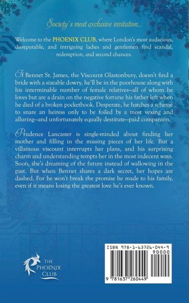 Society's most exclusive invitation... Welcome to the Phoenix Club, where London's most audacious, disreputable, and intriguing ladies and gentlemen find scandal, redemption, and second chances. If Bennet St. James, the Viscount Glastonbury, doesn't find a bride with a sizeable dowry, he'll be in the poorhouse along with his interminable number of female relatives-all of whom he loves but are a drain on the negative fortune his father left when he died of a broken pocketbook. Desperate, he hatches a scheme to snare an heiress only to be foiled by a most vexing and alluring-and unfortunately equally destitute-paid companion. ¿Prudence Lancaster is single-minded about finding her mother and filling in the missing pieces of her life. But a villainous viscount interrupts her plans, and his surprising charm and understanding tempts her in the most indecent ways. Soon, she's dreaming of the future instead of wallowing in the past. But when Bennet shares a dark secret, her hopes are dashed. For he won't break the promise he made to his family, even if it means losing the greatest love he's ever known.