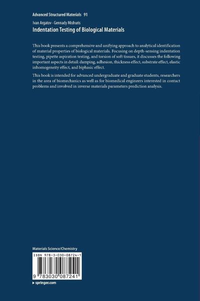This book presents a comprehensive and unifying approach to analytical identification of material properties of biological materials. Focusing on depth-sensing indentation testing, pipette aspiration testing, and torsion of soft tissues, it discusses the following important aspects in detail: damping, adhesion, thickness effect, substrate effect, elastic inhomogeneity effect, and biphasic effect.