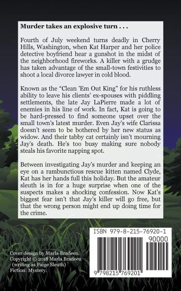 Murder takes an explosive turn . . . Fourth of July weekend turns deadly in Cherry Hills, Washington, when Kat Harper and her police detective boyfriend hear a gunshot in the midst of the neighborhood fireworks. A killer with a grudge has taken advantage of the small-town festivities to shoot a local divorce lawyer in cold blood. Known as the "Clean 'Em Out King" for his ruthless ability to leave his clients' ex-spouses with piddling settlements, the late Jay LaPierre made a lot of enemies in his line of work. In fact, Kat is going to be hard-pressed to find someone upset over the small town's latest murder. Even Jay's wife Clarissa doesn't seem to be bothered by her new status as widow. And their tabby cat certainly isn't mourning Jay's death. He's too busy making sure nobody steals his favorite napping spot. Between investigating Jay's murder and keeping an eye on a rambunctious rescue kitten named Clyde, Kat has her hands full this holiday. But the amateur sleuth is in for a huge surprise when one of the suspects makes a shocking confession. Now Kat's biggest fear isn't that Jay's killer will go free, but that the wrong person might end up doing time for the crime. All of the Cozy Cat Caper Mystery books can be enjoyed as standalones but will be better appreciated as part of the series. The books are light, fun cozy mysteries featuring an animal-loving female amateur sleuth, lovable and not-so-lovable quirky characters, and a page-turning mystery that needs solving. None of the books include cliffhangers, bad language, or graphic scenes.
