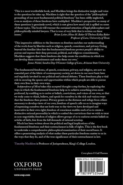 Independence of Mind takes this accepted thought a step further, by exploring the ways in which the fundamental freedoms help us to achieve something even more profound, by enabling us to arrive at beliefs, convictions and voices of our own, so that we truly come to think, believe and speak for ourselves in the rich and various ways that the freedoms then protect. Privacy grants us the distance and refuge from others necessary to develop views of our own; freedom of speech calls on us