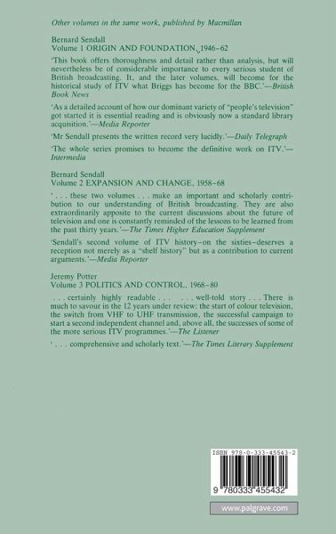 List of Plates - Preface and Acknowledgements - The Network - Labour Relations - ATV and Granada - The London Companies - Yorkshire and the North-East - Independent Television News - Southern and Anglia - Scotland and the Borders - Wales and the West of England - Westward and Channel - Northern Ireland - Drama - Light Entertainment - Documentaries and Current Affairs - Adult Education - School and Children's Programmes - Religion - Sport - Competition with the BBC - The Programme Journal - Preparing for the 1980s - The Breakfast-Time Contract - Controversial Awards - Appendix A: The Television Fund and Company Grants - Appendix B: Regional News - List of Abbreviations - References - Bibliography - Index