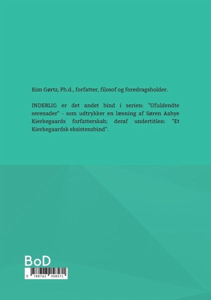 INDERLIG er det andet bind i serien: "Ufuldendte serenader" - som udtrykker en læsning af Søren Aabye Kierkegaards forfatterskab; deraf undertitlen: "Et Kierkegaardsk eksistensbind".