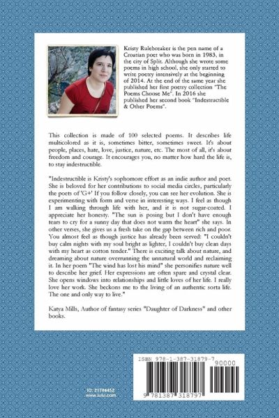 "Indestructible & Other Poems" is the second poetry collection by Kristy Rulebreaker. It describes life multicolored as it is, sometimes bitter, sometimes sweet. It's about people, places, hate, love, justice, nature, etc. The most of all, it's about freedom and courage. It encourages you, no matter how hard the life is, to stay indestructible.