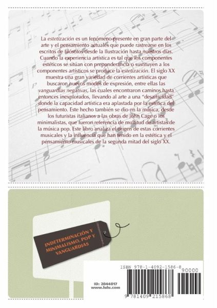 La estetización es un fenómeno presente en gran parte del arte y el pensamiento actuales que puede rastrearse en los escritos de filósofos desde la Ilustración hasta nuestros días. El siglo XX muestra una gran variedad de corrientes artísticas que buscaron nuevos modos de expresión, entre ellas las vanguardias negativas, las cuales encontraron caminos hasta entonces inexplorados, llevando al arte a una "desarticidad" donde la capacidad artística era aplastada por la estética del pensamiento Este hecho también se dio en la música, desde los futuristas italianos a las obras de John Cage o los minimalistas, que fueron referencia de multitud de artistas de la música pop. Este libro analiza el origen de estas corrientes musicales y la influencia que han tenido en la estética y el pensamiento musicales de la segunda mitad del siglo XX.