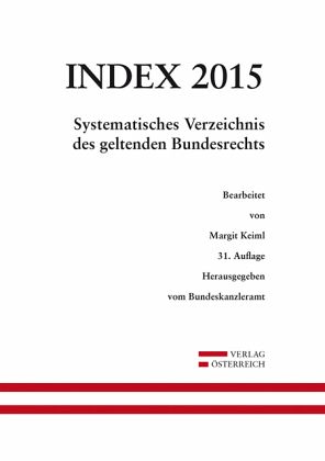 Der INDEX 2015, in der nunmehr 31. aktualisierten Auflage, enthält das zum Stichtag 1. Jänner 2015 geltende Bundesrecht, soweit es im Bundesgesetzblatt oder seinen Vorläufern kundgemacht ist. Durch den INDEX des Bundesrechts soll der Zugang zum Recht verbessert und die Information der Rechtsuchenden durch eine Übersicht über die in einem bestimmten Bereich geltenden Rechtsvorschriften erleichtert werden. Das chronologische Verzeichnis der geltenden Rechtsvorschriften des Bundes erleichtert das Auffinden einer Rechtsvorschrift im INDEX, wenn deren Fundstelle bekannt ist.