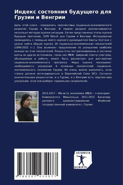 Cel' ätoj knigi - opredelit' perspektiwy social'no-äkonomicheskogo razwitiq Gruzii i Vengrii. V perwom razdele rassmatriwaütsq neskol'ko metodow ocenki situacii. Zatem predstawleny ätapy ocenki buduschih prognozow, SOFI Result dlq Gruzii i Vengrii. Issledowanie prowodilos' s pomosch'ü moego nauchnogo rukowoditelq Barty Zoltana s cel'ü najti obschuü ocenku 26 social'no-äkonomicheskih pokazatelej (1999-2025 gg.). Ono wklüchaet predlozheniq po uluchsheniü naibolee wazhnyh iz ätih pokazatelej. Rezul'taty äxtrapolirowany i chastichno wzqty iz drugih istochnikow, takih kak MVF. Shirokij spektr spektrow, obsuzhdaemyh w rabote, mozhet byt' rassmotren dlq dostizheniq social'no-äkonomicheskogo progressa. Nasha ocenka pokazywaet neobhodimost' uluchsheniq 6 osnownyh pokazatelej social'no-äkonomicheskogo polozheniq Gruzii. Ih ochen' wazhno wypolnit', esli strana dolzhna integrirowat'sq w Ewropejskij Soüz (ES). Soglasno okonchatel'nym rezul'tatam, i u Gruzii, i u Vengrii est' perspektiwa uluchsheniq, esli oni wyberut prawil'noe naprawlenie.