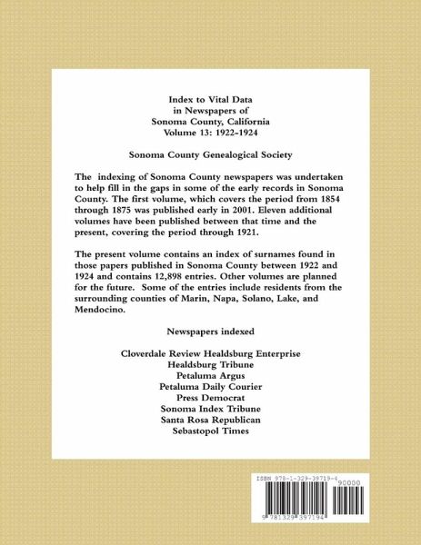 The indexing of Sonoma County newspapers was undertaken to help fill in the gaps in some of the early records in Sonoma County. The first volume, which covers the period from 1854 through 1875 was published early in 2001. Eleven additional volumes have been published between that time and the present, covering the period through 1921. The present volume contains an index of surnames found in those papers published in Sonoma County between 1922 and 1924 and contains 12,898 entries. Other volumes are planned for the future. Some of the entries include residents from the surrounding counties of Marin, Napa, Solano, Lake, and Mendocino.