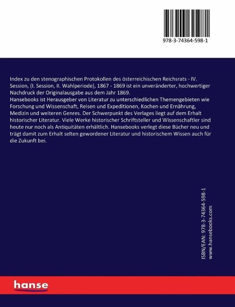 Index zu den stenographischen Protokollen des österreichischen Reichsrats - IV. Session, (I. Session, II. Wahlperiode), 1867 - 1869 ist ein unveränderter, hochwertiger Nachdruck der Originalausgabe aus dem Jahr 1869.