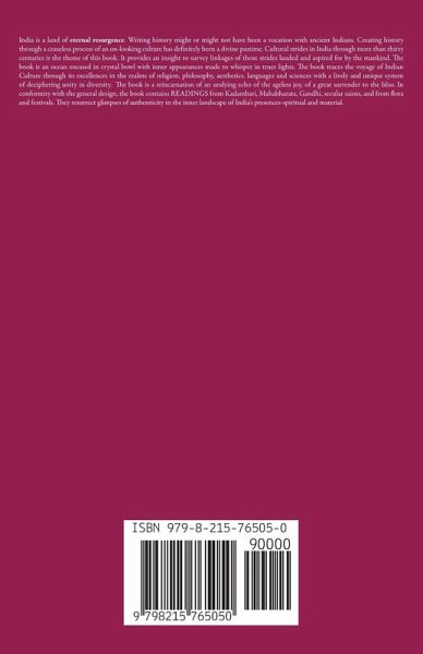 India is a land of eternal resurgence. Writing history might or might not have been a vocation with ancient Indians. Creating history through a ceaseless process of an on-looking culture has definitely been a divine pastime. Cultural strides in India through more than thirty centuries is the theme of this book. It provides an insight to survey linkages of those strides lauded and aspired for by the mankind. The book is an ocean encased in crystal bowl with inner appearances made to whisper in truer lights. The book traces the voyage of Indian Culture through its excellences in the realms of religion, philosophy, aesthetics. languages and sciences with a lively and unique system of deciphering unity in diversity. The book is a reincarnation of an undying echo of the ageless joy, of a great surrender to the bliss. In conformity with the general design, the book contains READINGS from Kadambari, Mahabharata, Gandhi, secular saints, and from flora and festivals. They resurrect glimpses of authenticity in the inner landscape of India's presences-spiritual and material.