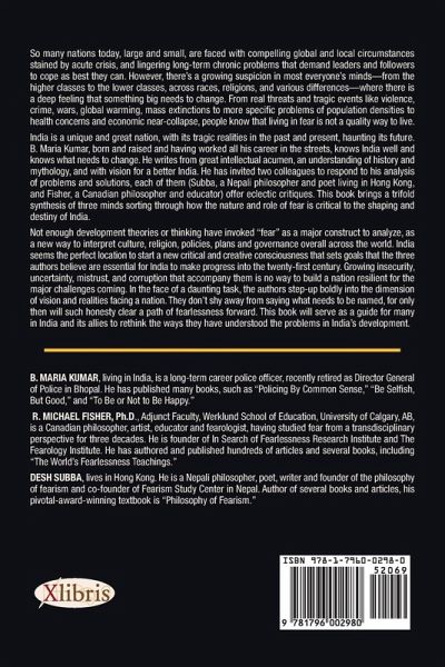 So many nations today, large and small, are faced with compelling global and local circumstances, breaking acute crises, and lingering long-term chronic problems that demand leaders and followers to cope as best they can. However, there's a growing suspicion in most everyone's minds-from the higher classes to the lower classes, across races, religions, and various differences-where there is a deep feeling that something big needs to change. From real threats and tragic events like violence, crime, wars, global warming, mass extinctions to more specific problems of population densities to health concerns and economic near-collapse, people know that living in fear is not a quality way to live. India is a unique and great nation, with its tragic realities in the past and present, haunting its future. B. Maria Kumar, born and raised and having worked all his career in the streets, knows India well and knows what needs to change. He writes from great intellectual acumen, an understanding of history and mythology, and with vision for a better India. He has invited two colleagues to respond to his analysis of problems and solutions, each of them (Subba, a Nepali philosopher and poet living in Hong Kong, and Fisher, a Canadian philosopher and educator) to respond to his views. This book brings a trifold synthesis of how the nature and role of fear is critical to the shaping and destiny of India. Not enough development theories or thinking have invoked "fear" as a major construct to analyze, as a new way to interpret culture, religion, policies, plans and governance overall across the world. India seems the perfect location to start a new critical and creative consciousness that sets goals that the three authors believe are essential for India to make progress into the twenty-first century. Growing insecurity, uncertainty, mistrust, and corruption that accompany them is no way to build a nation resilient for the major challenges coming. In the face of a daunting task, the authors step-up boldly into the dimension of vision and realities facing a nation. They don't shy away from saying what needs to be named, for only then will such honesty clear a path of fearlessness forward. This book will serve as a guide for many in India and its allies to rethink the ways they have understood the problems in India's development.