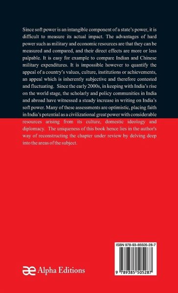 Since soft power is an intangible component of a state's power, it is difficult to measure its actual impact. The advantages of hard power such as military and economic resources are that they can be measured and compared, and their direct effects are more or less palpable. It is easy for example to compare Indian and Chinese military expenditures. It is impossible however to quantify the appeal of a country's values, culture, institutions or achievements, an appeal which is inherently subjective and therefore contested and fluctuating. Since the early 2000s, in keeping with India's rise on the world stage, the scholarly and policy communities in India and abroad have witnessed a steady increase in writing on India's soft power. Many of these assessments are optimistic, placing faith in India's potential as a civilizational great power with considerable resources arising from its culture, domestic ideology and diplomacy. The uniqueness of this book hence lies in the author's way of reconstructing the chapter under review by delving deep into the areas of the subject.