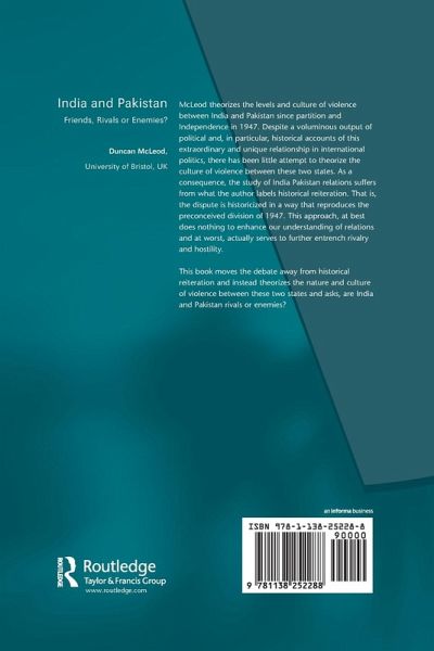 Are India and Pakistan rivals or enemies? Despite a voluminous output of political and, in particular, historical accounts of this extraordinary and unique relationship in international politics, there has been little attempt to theorize the culture of violence between these two states. As a consequence, the study of India-Pakistan relations suffers from what the author labels historical reiteration - that is, the dispute is historicized in a way that reproduces the preconceived division of 1947. Duncan McLeod moves the debate away from historical reiteration to instead theorize on the levels, nature and culture of violence between India and Pakistan since partition and independence in 1947. He examines the politicization of culture, cultures of rivalry and conflict, enmity and unlimited conflict. The volume will appeal to students and scholars in the fields of political theory, Asian politics and political sociology.