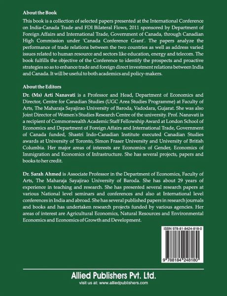 This book is a collection of selected papers presented at the International Conference on India-Canada Trade and FDI Bilateral Flows. The paper analyze the performance of the trade relations between the two countries as well as address varied issues related to human resource and sectors like education, energy and telecom. The book fulfills the objective of the Conference to identify the prospects and proactive strategies so as to enhance trade and foreign direct investment relations between India and Canada. It will be useful to both academics and policy-makers.