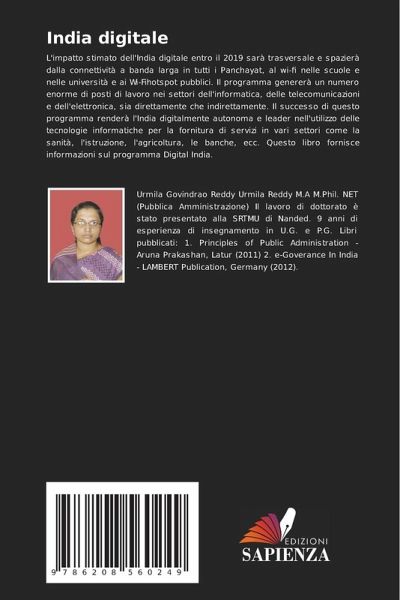 L'impatto stimato dell'India digitale entro il 2019 sarà trasversale e spazierà dalla connettività a banda larga in tutti i Panchayat, al wi-fi nelle scuole e nelle università e ai Wi-Fihotspot pubblici. Il programma genererà un numero enorme di posti di lavoro nei settori dell'informatica, delle telecomunicazioni e dell'elettronica, sia direttamente che indirettamente. Il successo di questo programma renderà l'India digitalmente autonoma e leader nell'utilizzo delle tecnologie informatiche per la fornitura di servizi in vari settori come la sanità, l'istruzione, l'agricoltura, le banche, ecc. Questo libro fornisce informazioni sul programma Digital India.