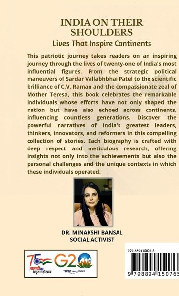 This patriotic journey takes readers on an inspiring journey through the lives of twenty-one of India's most influential figures. From the strategic political maneuvers of Sardar Vallabhbhai Patel to the scientific brilliance of C.V. Raman and the compassionate zeal of Mother Teresa, this book celebrates the remarkable individuals whose efforts have not only shaped the nation but have also echoed across continents, influencing countless generations. Discover the powerful narratives of India's greatest leaders, thinkers, innovators, and reformers in this compelling collection of stories. Each biography is crafted with deep respect and meticulous research, offering insights not only into the achievements but also the personal challenges and the unique contexts in which these individuals operated. "India on Their Shoulders" is more than a historical account; it is a source of motivation, a reflection on what makes leaders truly great, and a call to action for all of us to rise to our potential. Delve into the pages where the legacies of these towering figures inspire us to think bigger and act boldly in the pursuit of a better world.
