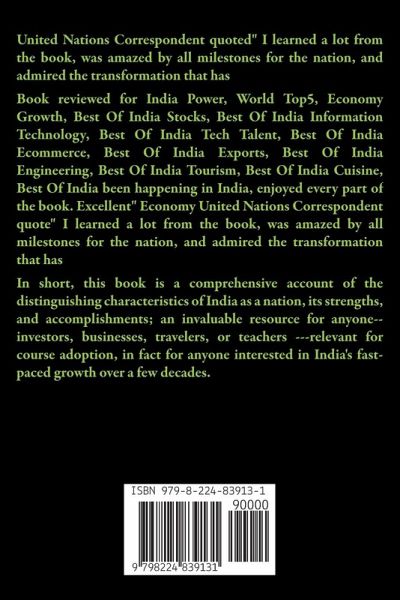 United Nations Correspondent quoted" I learned a lot from the book, was amazed by all milestones for the nation, and admired the transformation that has Book reviewed for India Power, World Top5, Economy Growth, Best Of India Stocks, Best Of India Information Technology, Best Of India Tech Talent, Best Of India Ecommerce, Best Of India Exports, Best Of India Engineering, Best Of India Tourism, Best Of India Cuisine, Best Of India been happening in India, enjoyed every part of the book. Excellent" Economy United Nations Correspondent quote" I learned a lot from the book, was amazed by all milestones for the nation, and admired the transformation that has In short, this book is a comprehensive account of the distinguishing characteristics of India as a nation, its strengths, and accomplishments; an invaluable resource for anyone-- investors, businesses, travelers, or for teachers ---relevant for course adoption, in fact for anyone interested in India's fast-paced growth over a few decades.