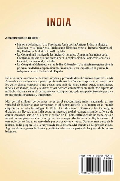 3 manuscritos completos en 1 libroHistoria de la India: Una Fascinante Guía por la Antigua India, la Historia Medieval, y la India Actual Incluyendo Historias como el Imperio Maurya, el Raj Británico, Mahatma Gandhi, y Más La Compañía Británica de las Indias Orientales: Una guía fascinante de la Compañía Inglesa que fue creada para la explotación del comercio con Asia Oriental, Sudoriental y la India La Compañía Holandesa de las Indias Orientales: Una fascinante guía sobre la primera verdadera corporación multinacional y su impacto en la guerra de independencia de Holanda de España La primera parte de este libro incluye:El Valle del Río Indo Mitología de la Era Védica India Aria y el Gran Debate Védico Alejandro el Grande El Imperio de Chandragupta Maurya Budismo y el Remordimiento de Ashoka El Retorno de los Griegos El Imperio de Gupta Descubrimientos Matemáticos Antiguos El Sultanato de Delhi Babur y el Imperio Mogol El Taj Mahal y una Historia de Amor India es "Redescubierta" por Portugal El Imperio de Maratha ¡Y mucho, mucho más! Segunda parte de este libro, usted:El primer siglo de la Compañía: Establecimiento y crecimiento de la EIC, rivales y conflictos El segundo siglo de la Compañía: Crecimiento y expansión, comercio con China, crisis financieras y "estadidad" El tercer siglo de la Compañía: Las hazañas militares de la EIC, el nacionalismo indio, las ideologías raciales y religiosas, y la disolución de la EIC Efectos de la EIC: Cambios en la sociedad británica, impacto en los grupos de población local y crecimiento del Imperio británico Individuos notables de la Era de la EIC. ¡Y mucho, mucho más! la tercera parte de este libro incluye:Nacimiento de una corporación La Compañía en ascenso La caída del gigante Estructura y organización del VOC Vereenigde Oostindische Compagnie (Compañía holandesa de las Indias Orientales) Lo bueno, lo malo del VOC Vereenigde Oostindische Compagnie (Compañía holandesa de las Indias Orientales) ¡Y mucho, mucho más! ¡Obtenga este libro ahora para aprender más sobre India!