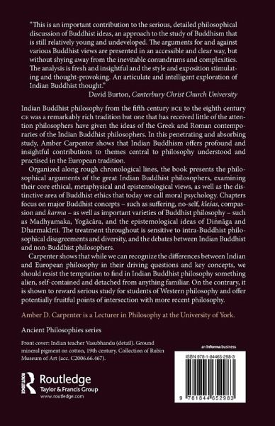 Organised in broadly chronological terms, this book presents the philosophical arguments of the great Indian Buddhist philosophers of the fifth century BCE to the eighth century CE. Each chapter examines their core ethical, metaphysical and epistemological views as well as the distinctive area of Buddhist ethics that we call today moral psychology. Throughout, this book follows three key themes that both tie the tradition together and are the focus for most critical dialogue: the idea of anatman or no-self, the appearance/reality distinction and the moral aim, or ideal. Indian Buddhist philosophy is shown to be a remarkably rich tradition that deserves much wider engagement from European philosophy. Carpenter shows that while we should recognise the differences and distances between Indian and European philosophy, its driving questions and key conceptions, we must resist the temptation to find in Indian Buddhist philosophy, some Other, something foreign, self-contained and quite detached from anything familiar. Indian Buddhism is shown to be a way of looking at the world that shares many of the features of European philosophy and considers themes central to philosophy understood in the European tradition.