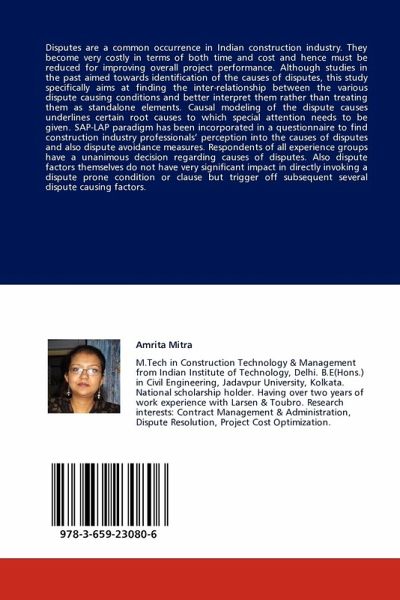 Disputes are a common occurrence in Indian construction industry. They become very costly in terms of both time and cost and hence must be reduced for improving overall project performance. Although studies in the past aimed towards identification of the causes of disputes, this study specifically aims at finding the inter-relationship between the various dispute causing conditions and better interpret them rather than treating them as standalone elements. Causal modeling of the dispute causes underlines certain root causes to which special attention needs to be given. SAP-LAP paradigm has been incorporated in a questionnaire to find construction industry professionals perception into the causes of disputes and also dispute avoidance measures. Respondents of all experience groups have a unanimous decision regarding causes of disputes. Also dispute factors themselves do not have very significant impact in directly invoking a dispute prone condition or clause but trigger off subsequent several dispute causing factors.