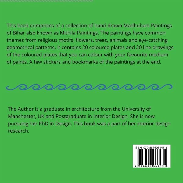 This book comprises of a collection of hand drawn Madhubani Paintings of Bihar also known as Mithila Paintings. The paintings have common themes from religious motifs, flowers, trees, animals and eye-catching geometrical patterns. It contains 20 colored plates and 20 line drawings of the colored plates that you can color with your favorite medium of paints. A few stickers and bookmarks of the paintings at the end.