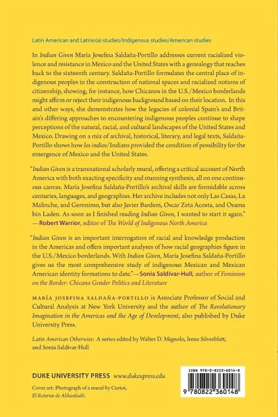 In Indian Given Maria Josefina Saldana-Portillo provides a sweeping historical and comparative analysis of racial ideologies in Mexico and the United States from 1550 to the present to show how indigenous peoples provided the condition of possibility for the emergence of each nation.