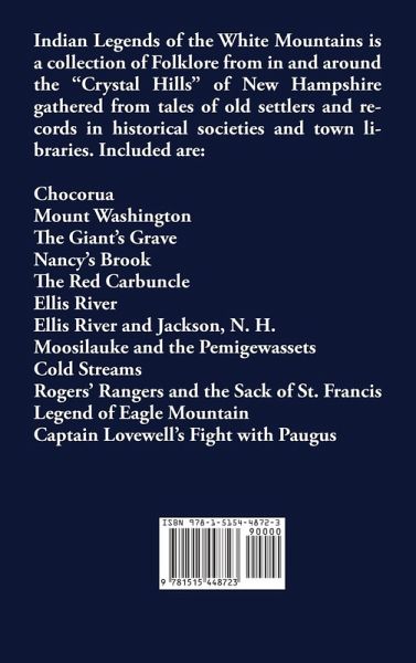 Indian Legends of the White Mountains is a collection of Folklore from in and around the "Crystal Hills" of New Hampshire gathered from tales of old settlers and records in historical societies and town libraries. Included are: Chocorua Mount Washington The Giant's Grave Nancy's Brook The Red Carbuncle Ellis River Ellis River and Jackson, N. H. Moosilauke and the Pemigewassets Cold Streams Rogers' Rangers and the Sack of St. Francis Legend of Eagle Mountain Captain Lovewell's Fight with Paugus