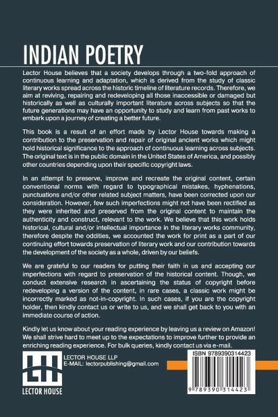 Indian Poetry: Containing "The Indian Song Of Songs," From The Sanskrit Of The Gîta Govinda Of Jayadeva, Two Books From "The Iliad Of India" (Mahábhárata), "Proverbial Wisdom" From The Shlokas Of The Hitopade¿a, And Other Oriental Poems This book is a result of an effort made by us towards making a contribution to the preservation and repair of original classic literature. In an attempt to preserve, improve and recreate the original content, we have worked towards: 1. Type-setting & Reformatting: The complete work has been re-designed via professional layout, formatting and type-setting tools to re-create the same edition with rich typography, graphics, high quality images, and table elements, giving our readers the feel of holding a 'fresh and newly' reprinted and/or revised edition, as opposed to other scanned & printed (Optical Character Recognition - OCR) reproductions. 2. Correction of imperfections: As the work was re-created from the scratch, therefore, it was vetted to rectify certain conventional norms with regard to typographical mistakes, hyphenations, punctuations, blurred images, missing content/pages, and/or other related subject matters, upon our consideration. Every attempt was made to rectify the imperfections related to omitted constructs in the original edition via other references. However, a few of such imperfections which could not be rectified due to intentional\unintentional omission of content in the original edition, were inherited and preserved from the original work to maintain the authenticity and construct, relevant to the work. We believe that this work holds historical, cultural and/or intellectual importance in the literary works community, therefore despite the oddities, we accounted the work for print as a part of our continuing effort towards preservation of literary work and our contribution towards the development of the society as a whole, driven by our beliefs. We are grateful to our readers for putting their faith in us and accepting our imperfections with regard to preservation of the historical content. HAPPY READING!