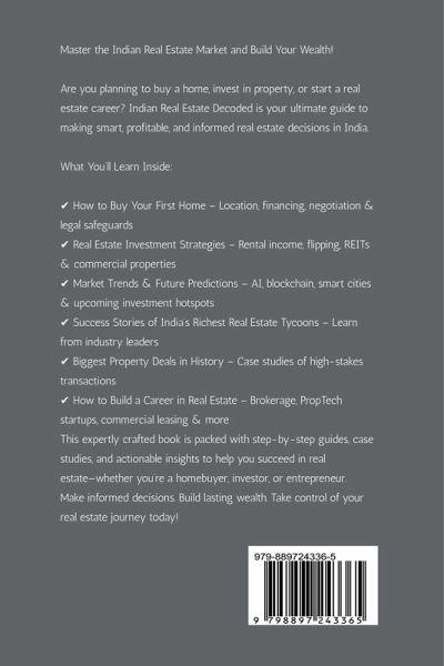 Indian Real Estate Decoded: A Homebuyer's Guide and Career Launchpad Unlock the Secrets to Smart Real Estate Decisions in India! Whether you're a first-time homebuyer, a seasoned investor, or an aspiring real estate entrepreneur, this book is your ultimate guide to navigating India's dynamic property market. ✔ Buying Your Dream Home? Learn how to choose the right location, secure financing, and avoid legal pitfalls. ✔ Investing for Wealth? Discover proven strategies for rental income, property flipping, and commercial real estate. ✔ Building a Real Estate Career? Explore high-growth opportunities in brokerage, development, and PropTech. What You'll Learn Inside: ✅ Step-by-Step Home Buying Process - From property selection to legal checks and financing options. ✅ Insider Investment Strategies - Master real estate cycles, tax planning, and high-return investments. ✅ Market Trends & Future Predictions - AI, blockchain, smart cities, and emerging opportunities. ✅ Lessons from India's Richest Real Estate Tycoons - Learn how industry leaders built billion-dollar empires. ✅ Record-Breaking Real Estate Deals - Case studies of the biggest property transactions in history. Whether you're buying your first home, expanding your property portfolio, or exploring a real estate career, Indian Real Estate Decoded is your one-stop guide to making informed, profitable decisions in real estate. Get your copy today and take control of your real estate future!