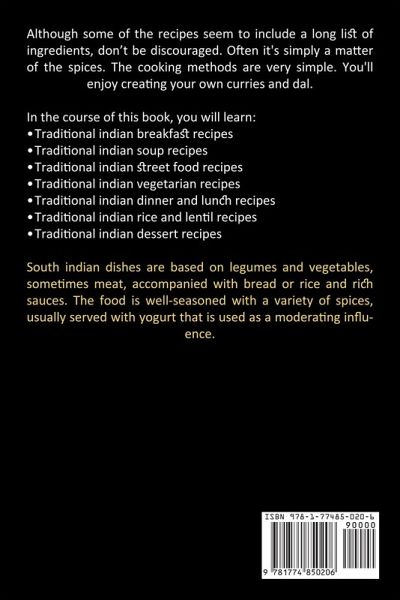 Although some of the recipes seem to include a long list of ingredients, don't be discouraged. Often it's simply a matter of the spices. The cooking methods are very simple. You'll enjoy creating your own curries and dal. In the course of this book, you will learn: ¿ Traditional indian breakfast recipes ¿ Traditional indian soup recipes ¿ Traditional indian street food recipes ¿ Traditional indian vegetarian recipes ¿ Traditional indian dinner and lunch recipes ¿ Traditional indian rice and lentil recipes ¿ Traditional indian dessert recipes South indian dishes are based on legumes and vegetables, sometimes meat, accompanied with bread or rice and rich sauces. The food is well-seasoned with a variety of spices, usually served with yogurt that is used as a moderating influence.