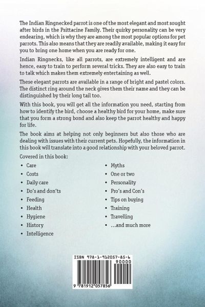 indian ringneck Indian Ringneck. Indian Ringnecks as pets. Indian Ringneck Keeping, Pros and Cons, Care, Housing, Diet and Health. The Indian Ringnecked parrot is one of the most elegant and most sought after birds in the Psittacine Family. Their quirky personality can be very endearing, which is why they are among the most popular options for pet parrots. This also means that they are readily available, making it easy for you to bring one home when you are ready for one.Indian Ringnecks, like all parrots, are extremely intelligent and are hence, easy to train to perform several tricks. They are also easy to train to talk which makes them extremely entertaining as well.These elegant parrots are available in a range of bright and pastel colors. The distinct ring around the neck gives them their name and they can be distinguished by their long tail too.With this book, you will get all the information you need, starting from how to identify the bird, choose a healthy bird for your home, make sure that you form a strong bond and also keep the parrot healthy and happy for life.The book aims at helping not only beginners but also those who are dealing with issues with their current pets. Hopefully, the information in this book will translate into a good relationship with your beloved parrot. Covered in this book:CareCostsDaily careDo's and don'tsFeedingHealthHygieneHistoryIntelligenceMythsOne or twoPersonalityPro's and Con'sTips on buyingTrainingTravelling...and much more