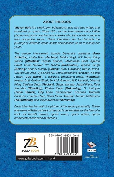 Book on Indian sports personalities Vijayan Bala is a well-known sports journalist, commentator, and educationist. He has interviewed prominent Indian players, coaches and umpires who have made a name in their respective sports. These interviews have appeared in leading newspapers such as the Hindustan Times and Rajasthan Patrika (English) and in well-known magazines such as Sportsweek, SWARAJYA, Weekend Review, Woman's EraWoman's EraWoman's Era and ALIVE. These interviews aim to chronicle the sportmans journey and to provide inspiration, guide, information to the reader. The people interviewed in this Indian sports book, include Indian sporting greats as Saina Nehwal, P.V.Sindhu (Badminton); Vijender Singh (Boxing); Devendra Jhajharia (Paralympics); Limba Ram (Archery); Milkha Singh, P.T. Usha, Shiny Abraham Wilson (Athletics); Dinesh Khanna, Madhumita Bisht, Aparna Popat, Koneri Humpy (Chess); Sunil Gavaskar, Rahul Dravid, Chetan Chauhan, Syed Abid Ali, Smriti Mandhana (Cricket); Pankaj Advani (Cue Sports); T. Balaram, Bhaichung Bhutia (Football); Gurbux Singh, Dr. M.P. Ganesh, M.K. Kaushik, Dhanraj Pillay, Sardara Singh (Hockey); Gagan Narang, Jaspal Rana, Rahi Sarnabot (Shooting); G. Sathiyan (Table Tennis); Ramanathan Krishnan, Ramesh Krishnan, Leander Paes, Sania Mirza (Tennis); Karnam Malleswari (Weightlifting) and Yogeshwar Dutt (Wrestling). Indian sports book will benefit players, sports lovers, sports writers, sports broadcasters and libraries and also serve as an inspiration for our youth.