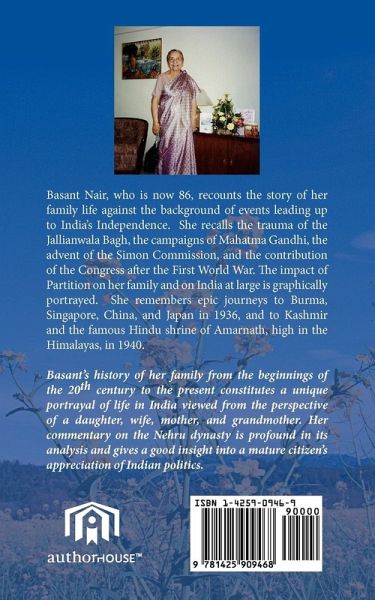 Basant Nair, who is now 86, recounts the story of her family life against the background of events leading up to India's Independence. She recalls the trauma of the Jallianwala Bagh, the campaigns of Mahatma Gandhi, the advent of the Simon Commission, and the contribution of the Congress after the First World War. The impact of Partition on her family and on India at large is graphically portrayed. She remembers epic journeys to Burma, Singapore, China, and Japan in 1936, and to Kashmir and the famous Hindu shrine of Amarnath, high in the Himalayas, in 1940. Basant is able to share some of her most difficult moments of great personal tragedy. She recounts the social life of the clubs and the air force stations before and after the Raj. As time progresses, new family members arrive, while others pass on. She reflects on her husband's resignation from the Air Force and the sale of their Delhi house. Now only Basant and her younger sister of the seven siblings survive, but she is consoled by her new role as grandmother, and great-grandmother. Basant's history of her family from the beginnings of the 20th century to the present constitutes a unique portrayal of life in India viewed from the perspective of a daughter, wife, mother, and grandmother. Her commentary on the Nehru dynasty is profound in its analysis and gives a good insight into a mature citizen's appreciation of Indian politics. This is a book for those interested in India's remarkable progression during the last century.