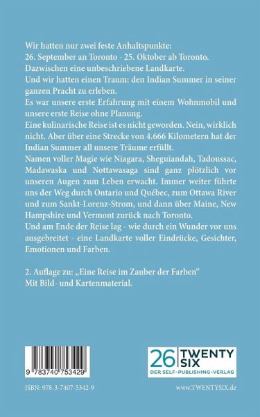 26. September an Toronto - 25. Oktober ab Toronto.Dazwischen eine leere, unbeschriebene Landkarte und ein großer Traum: den Indian Summer erleben.So sah es aus, als die Autorin sich das erste Mal gemeinsam mit ihrem Mann mit einem Wohnmobil auf die Reise machte.Eine kulinarische Reise ist es nicht geworden. Nein, wirklich nicht. Aber über eine Strecke von 4.666 Kilometern hat der Indian Summer all ihre Träume erfüllt.Durch Ontario und Québec, zum Ottawa River und über den Sankt-Lorenz-Strom hat der Weg die Autorin geführt. Geheimnisvolle Namen wie Sheguiandah, Tadoussac, Madawaska oder Nottawasaga sind langsam vor ihren Augen zum Leben erwacht, und dann ging es über Maine, New Hampshire und Vermont zurück nach Toronto.Und am Ende ihrer Reise lag, wie durch ein Wunder vor ihr ausgebreitet, eine Landkarte voller Eindrücke, Gesichter, Emotionen und Farben.2. Auflage von "Eine Reise im Zauber der Farben"Mit Adressen, Bild- und Kartenmaterial