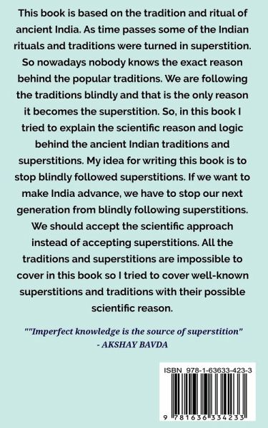 This book is based on the tradition and ritual of ancient India. As time passes some of the Indian rituals and traditions were turned in superstition. So nowadays nobody knows the exact reason behind the popular traditions. We are following the traditions blindly and that is the only reason it becomes the superstition. So, in this book I tried to explain the scientific reason and logic behind the ancient Indian traditions and superstitions. My idea for writing this book is to stop blindly followed superstitions. If we want to make India advance, we have to stop our next generation from blindly following superstitions. We should accept the scientific approach instead of accepting superstitions. All the traditions and superstitions are impossible to cover in this book so I tried to cover well-known superstitions and traditions with their possible scientific reason.
