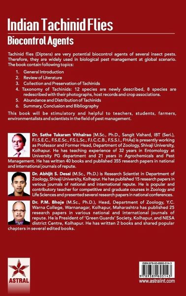 Tachinid flies (Diptera) are very potential biocontrol agents of several insect pests. Therefore, they are widely used in biological pest management at global scenario. The book contain following topics: 1. General Introduction 2. Review of Literature 3. Collection and Preservation of Tachinids 4. Taxonomy of Tachinids: 12 species are newly described, 8 species are redescribed with their photographs, host records and crop associations. 5. Abundance and Distribution of Tachinids 6. Summary, Conclusion and Bibliography This book will be stimulatory and helpful to teachers, students, farmers, environmentalists and scientists in the field of pest management. .