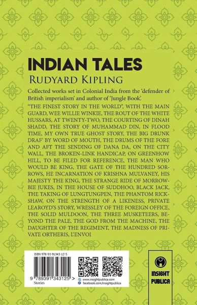 Collected works set in Colonial India from the 'defender of British imperialism' and author of 'Jungle Book'. "THE FINEST STORY IN THE WORLD", WITH THE MAIN GUARD, WEE WILLIE WINKIE, THE ROUT OF THE WHITE HUSSARS, AT TWENTY-TWO, THE COURTING OF DINAH SHADD, THE STORY OF MUHAMMAD DIN, IN FLOOD TIME, MY OWN TRUE GHOST STORY, THE BIG DRUNK DRAF' BY WORD OF MOUTH, THE DRUMS OF THE FORE AND AFT THE SENDING OF DANA DA, ON THE CITY WALL, THE BROKEN-LINK HANDICAP, ON GREENHOW HILL, TO BE FILED FOR REFERENCE, THE MAN WHO WOULD BE KING, THE GATE OF THE HUNDRED SORROWS, HE INCARNATION OF KRISHNA MULVANEY, HIS MAJESTY THE KING, THE STRANGE RIDE OF MORROWBIE JUKES, IN THE HOUSE OF SUDDHOO, BLACK JACK, THE TAKING OF LUNGTUNGPEN, THE PHANTOM RICKSHAW, ON THE STRENGTH OF A LIKENESS, PRIVATE LEAROYD'S STORY, WRESSLEY OF THE FOREIGN OFFICE, THE SOLID MULDOON, THE THREE MUSKETEERS, BEYOND THE PALE, THE GOD FROM THE MACHINE, THE DAUGHTER OF THE REGIMENT, THE MADNESS OF PRIVATE ORTHERIS, L'ENVOI