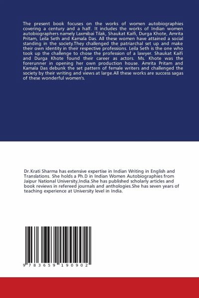 The present book focuses on the works of women autobiographies covering a century and a half. It includes the works of Indian women autobiographers namely Laxmibai Tilak, Shaukat Kaifi, Durga Khote, Amrita Pritam, Leila Seth and Kamala Das. All these women have attained a social standing in the society.They challenged the patriarchal set up and make their own identity in their respective professions. Leila Seth is the one who took up the challenge to chose the profession of a lawyer. Shaukat Kaifi and Durga Khote found their career as actors. Ms. Khote was the forerunner in opening her own production house. Amrita Pritam and Kamala Das debunk the set pattern of female writers and challenged the society by their writing and views at large.All these works are success sagas of these wonderful women's.