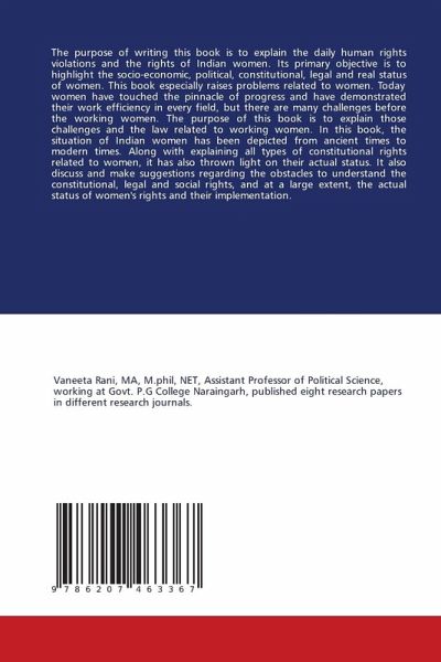 The purpose of writing this book is to explain the daily human rights violations and the rights of Indian women. Its primary objective is to highlight the socio-economic, political, constitutional, legal and real status of women. This book especially raises problems related to women. Today women have touched the pinnacle of progress and have demonstrated their work efficiency in every field, but there are many challenges before the working women. The purpose of this book is to explain those challenges and the law related to working women. In this book, the situation of Indian women has been depicted from ancient times to modern times. Along with explaining all types of constitutional rights related to women, it has also thrown light on their actual status. It also discuss and make suggestions regarding the obstacles to understand the constitutional, legal and social rights, and at a large extent, the actual status of women's rights and their implementation.